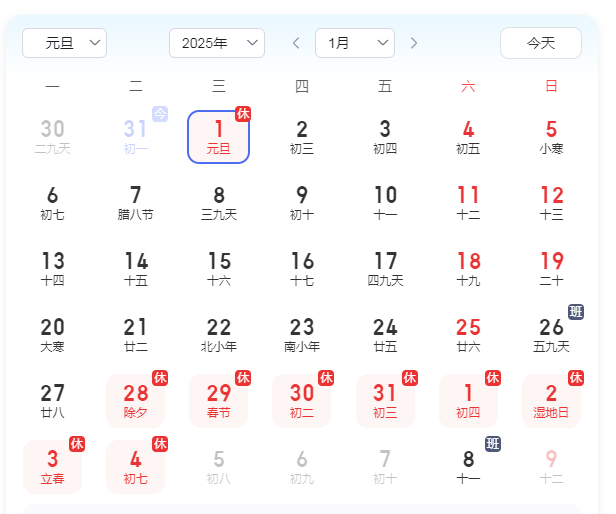 关于2025年中丰建科(北京)集团元旦放假的通知发表时间:2024-12-31 09:50 年复一年春又来,万象更新景更佳,根据2025年《国务院办公厅关于2025年部分节假日的通知》,结合我集团整体情况,现将2025年元旦放假通知如下: 一、放假时间: 2025年1月1日(星期三)放假共一天,2025年1月2日(星期四)正常上班。提前预祝各位心想事成,工作顺利。元旦快乐!